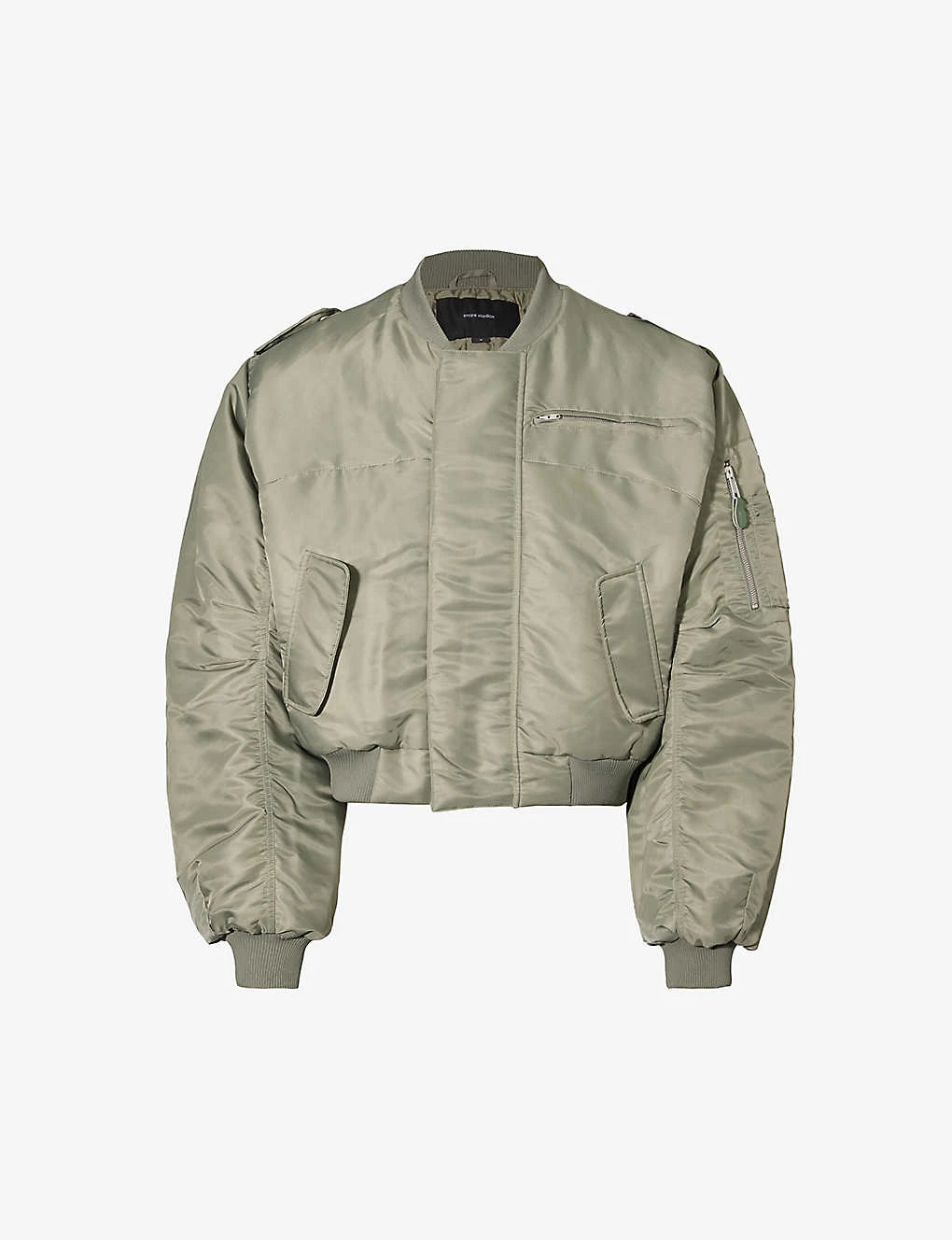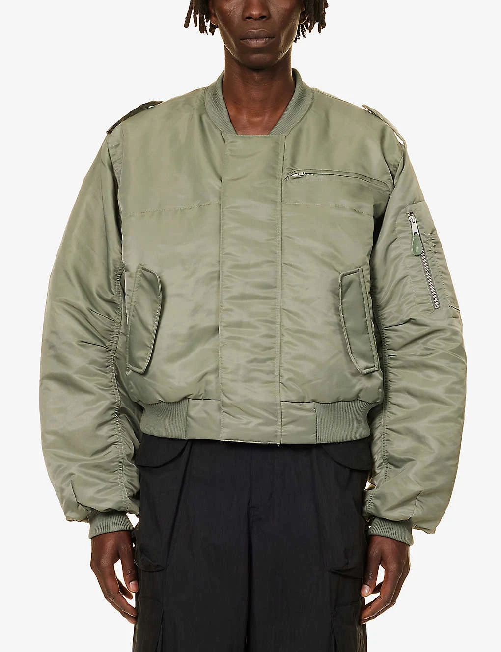 - Boxy fit, stand collar, popper-fastened epaulettes at shoulders, dropped shoulders, long sleeves, zipped pocket at chest, two flap pockets at front, lightly padded, fully lined, ribbed trims
