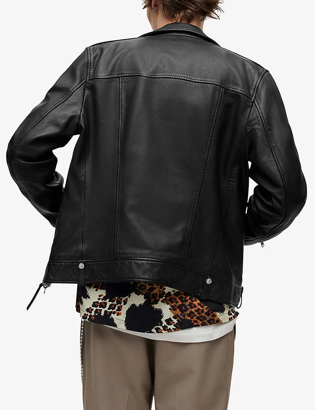 Slim-fit, biker collar, long sleeves, zip-fastened cuffs, zip pockets at front popper-fastened flap pocket at front, silver-toned hardware, popper-fastened loops at hem