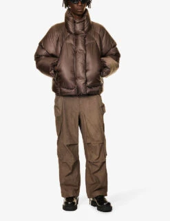 - Funnel neck, drawstring hood, long sleeves, embroidered brand patch at sleeve, elasticated cuffs, thumb holes, two zipped pockets at sides, all-over quilted, fully padded and lined
