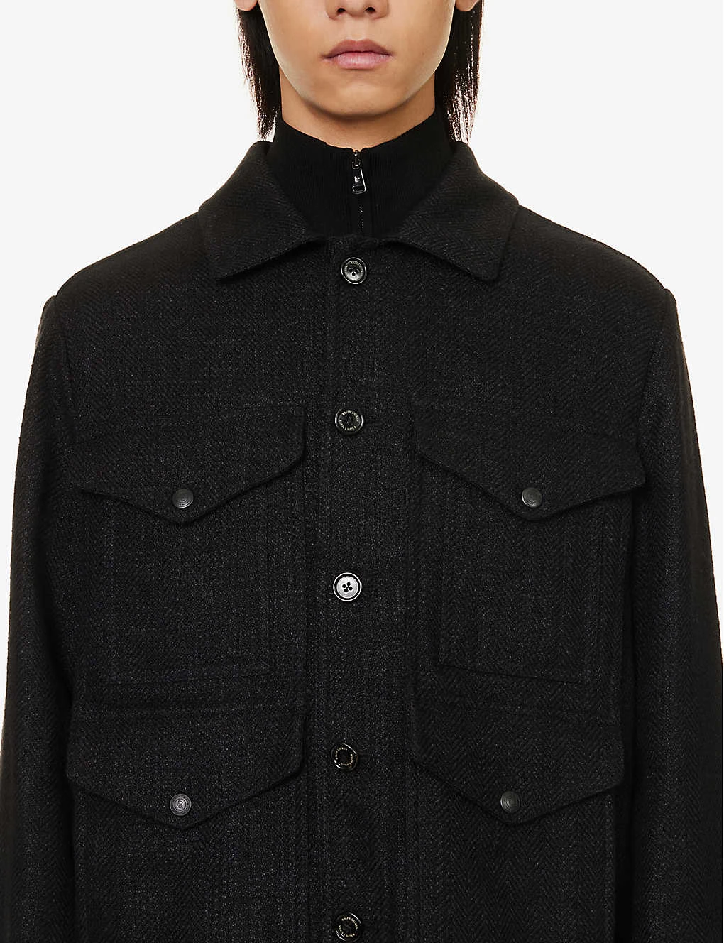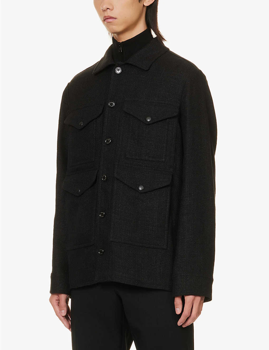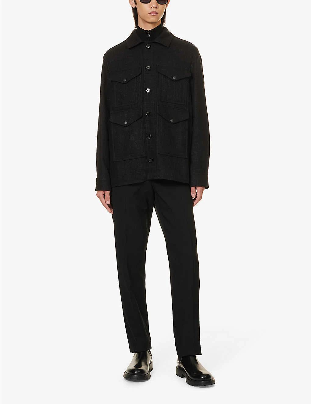 - Regular fit, spread collar, long sleeves, adjustable buttoned cuffs, four popper-fastened flap pockets at front, two slip pockets at sides, branded hardware, partially lined