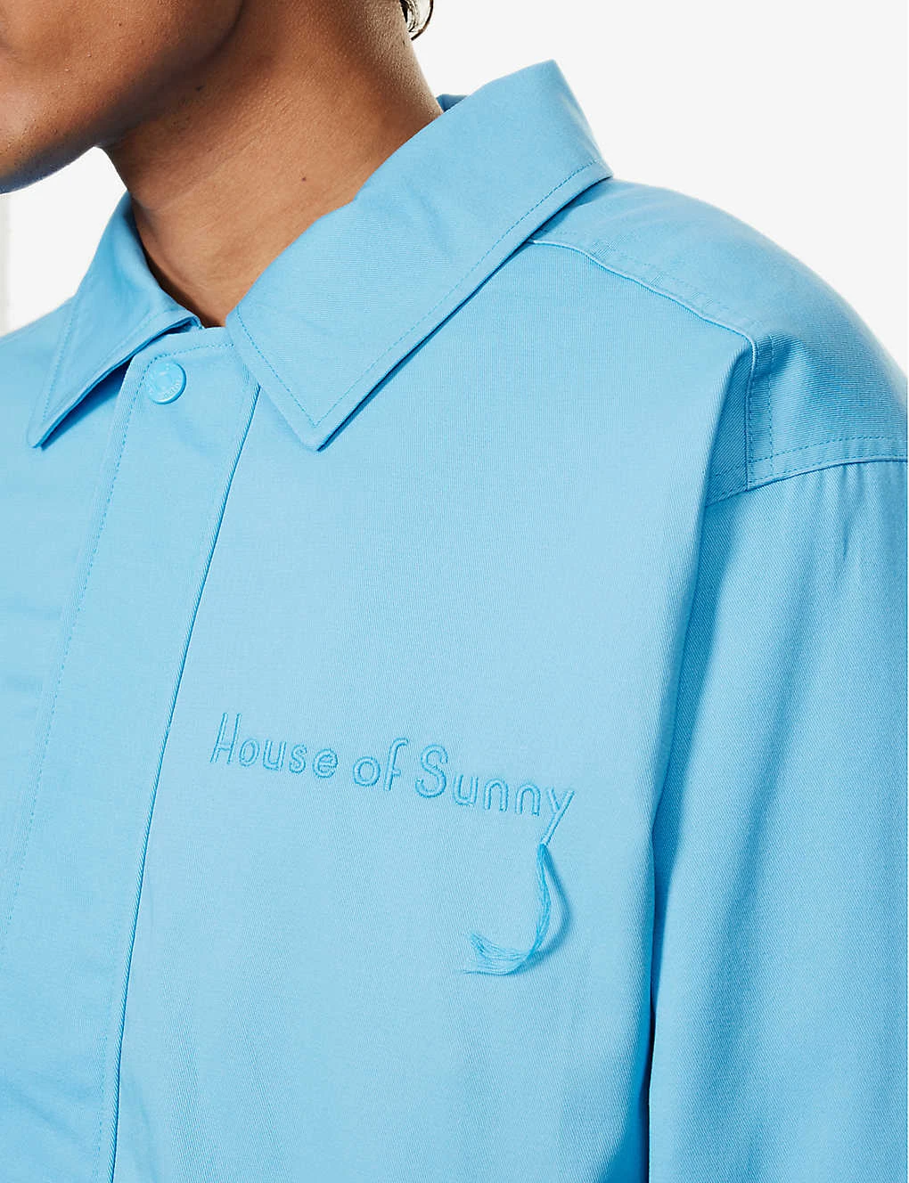 - Relaxed fit, spread collar, long dolman sleeves, branded buttons, two welt pockets at front, embroidered branding at chest, elasticated waistband, fully lined