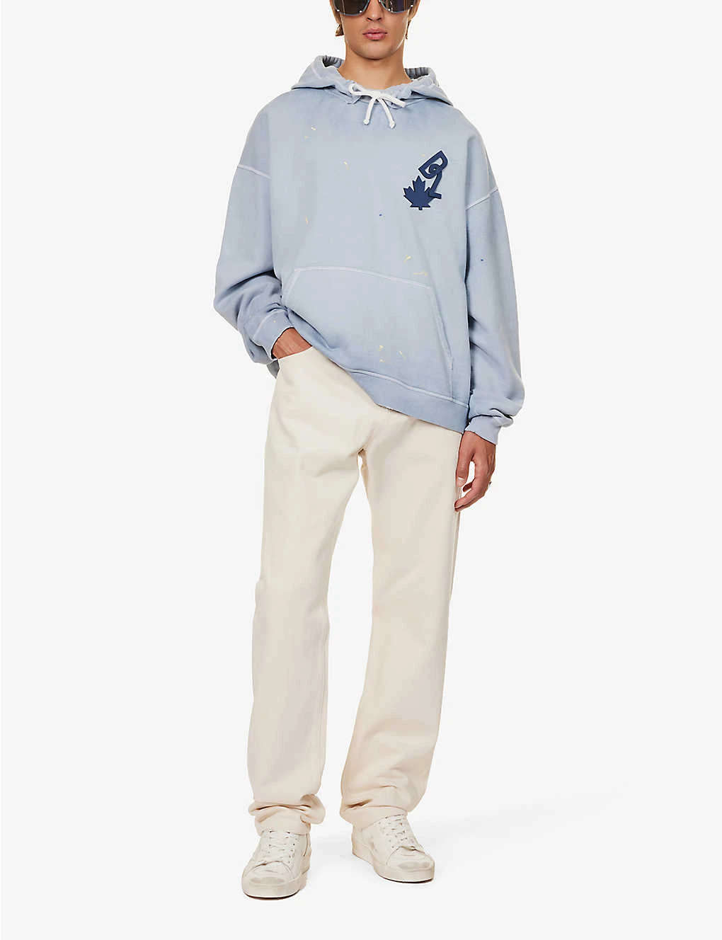 - Relaxed fit, crewneck, drawstring hood, dropped shoulders, long sleeves, brand patch at chest, kangaroo pocket at front, exposed seams, faded wash and paint splatters, ribbed trims
