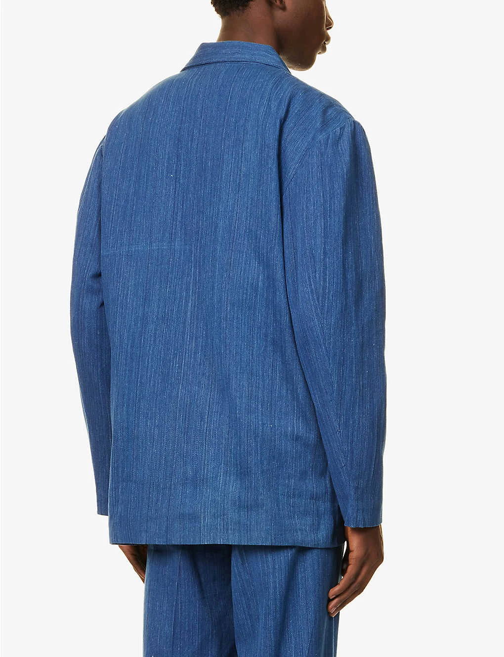 - Regular fit, notched lapels, long sleeves, two patch pockets at front, beaded floral embroidery at front, natural indigo dye, hand-embroidered, handwoven, fully lined