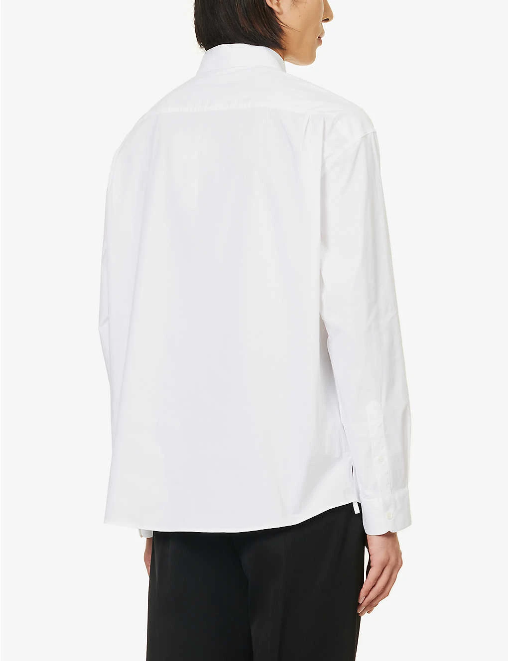- Boxy fit, long sleeves, pleated cuffs, patch pocket at chest, branded bow embellishment at chest, pleated yoke, pearlescent buttons, curved hem