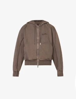 - Boxy fit, drawstring hood, dropped shoulders, long sleeves, chunky strap embellishments at sleeves, embroidered branding at chest, split kangaroo pockets at front, two-way zip fastening, silver-toned hardware, ribbed trims