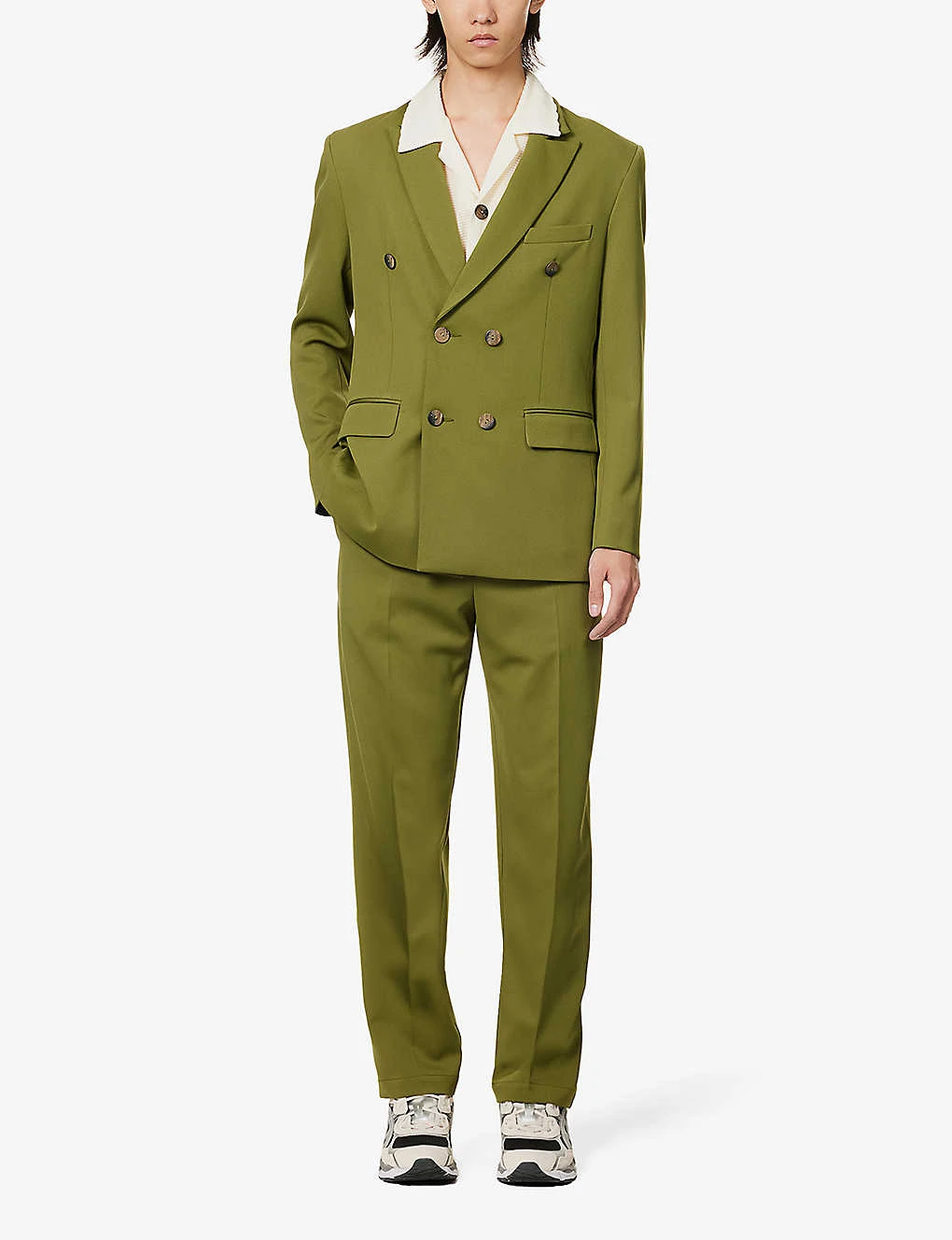 - Relaxed fit, peak lapel, double-breasted, padded shoulders, long sleeves, straight cuffs, welt pocket and two flap pockets at front, darts at front and back, all over twill texture, fully lined, double vent