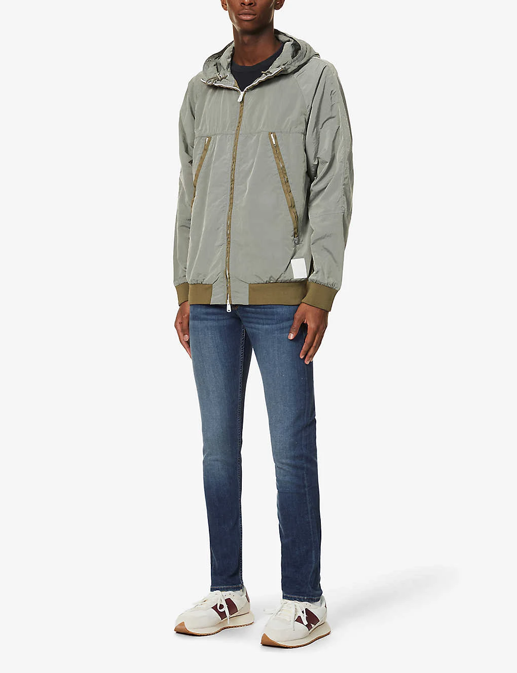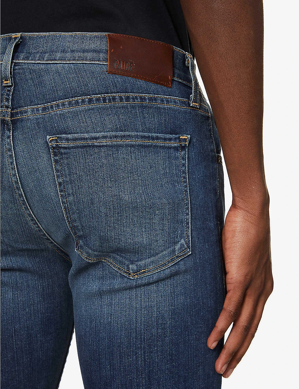 Slim-fit, skinny, mid-rise, faded wash and whiskering, contrast stitching, belt loops, five pockets, branded hardware, branded leather patch at back waistband, v-shaped yoke at back