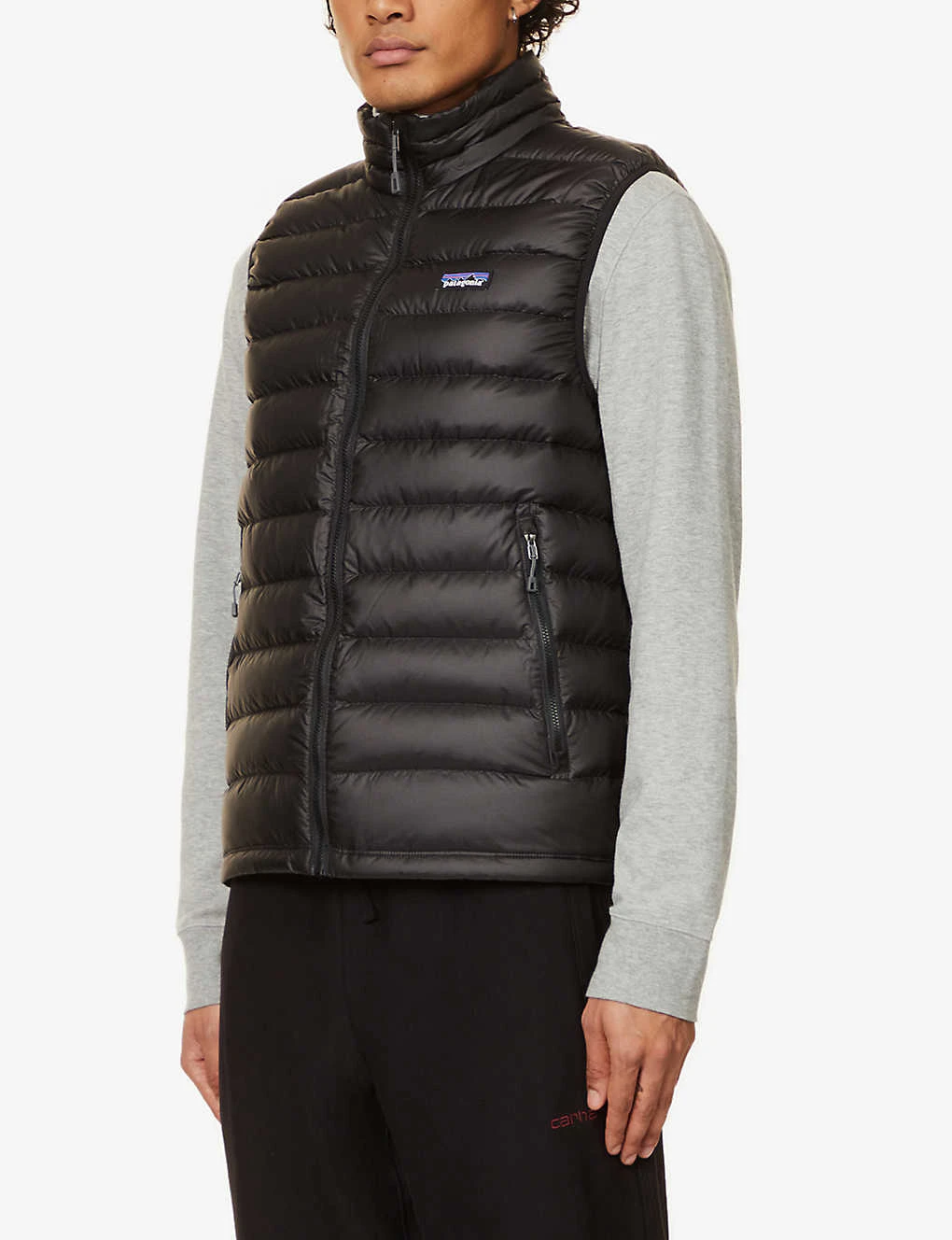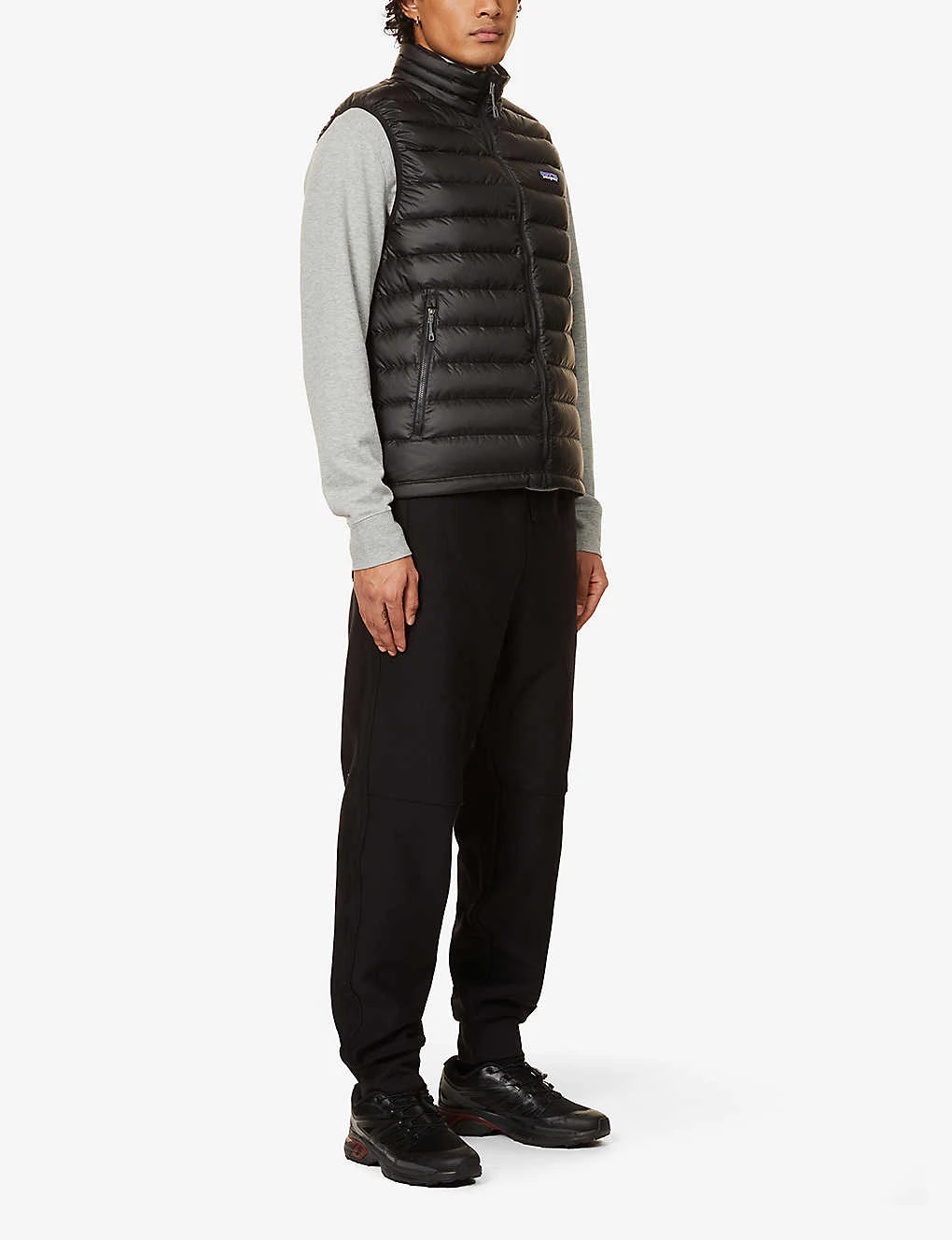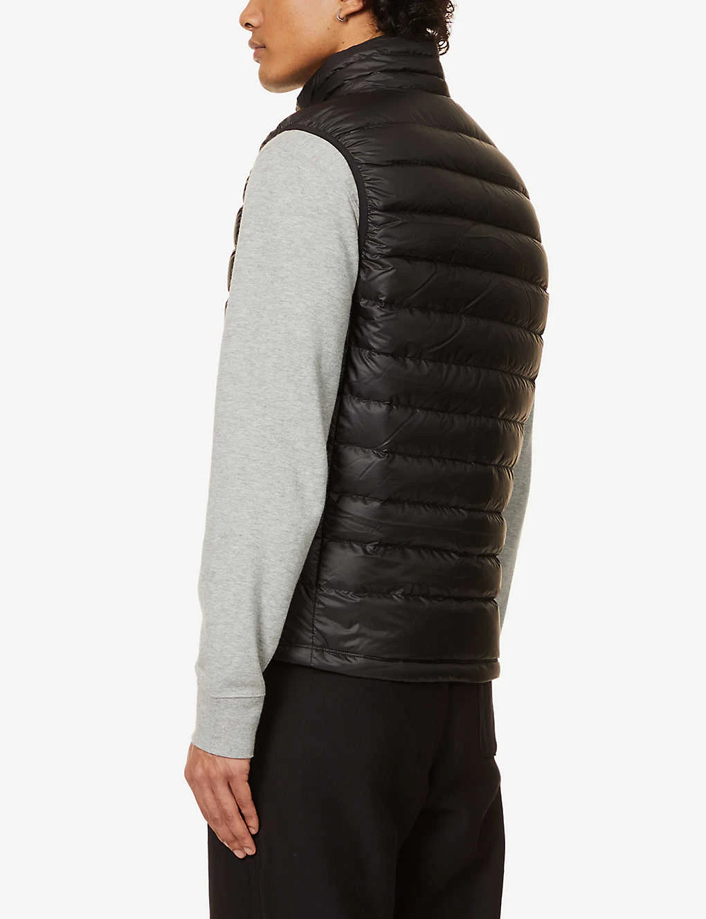Regular fit, high neck, sleeveless, brand logo patch at front, two zipped pockets at front, drawstring at hem, all over quilted
