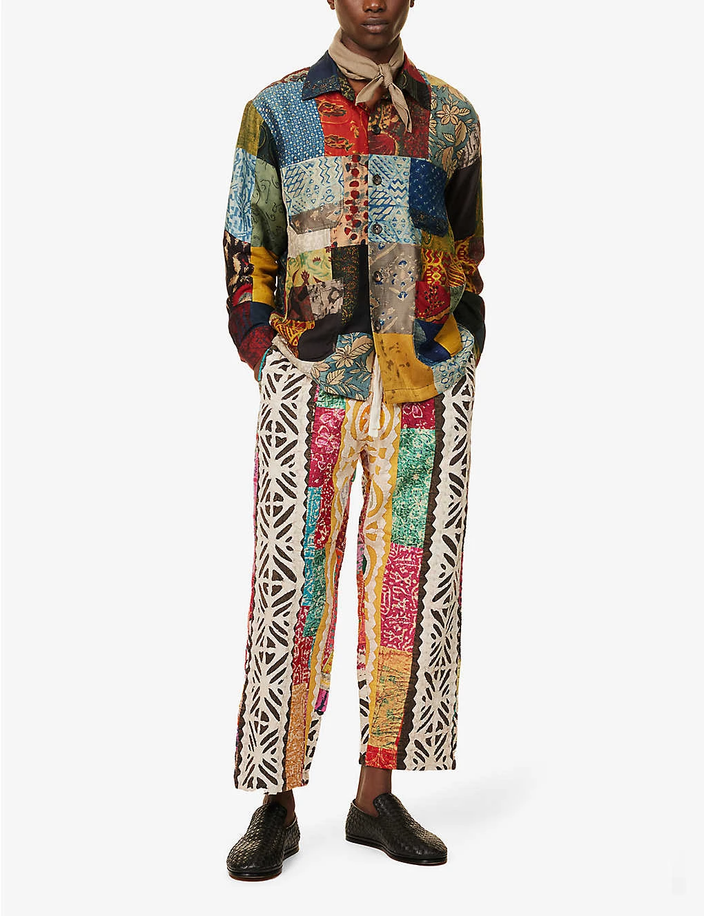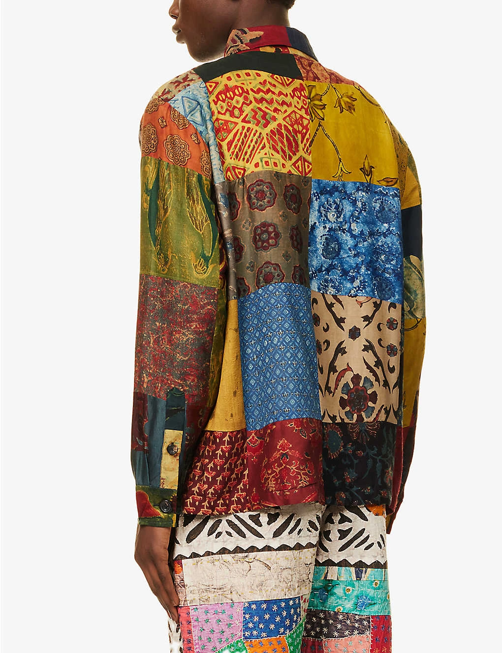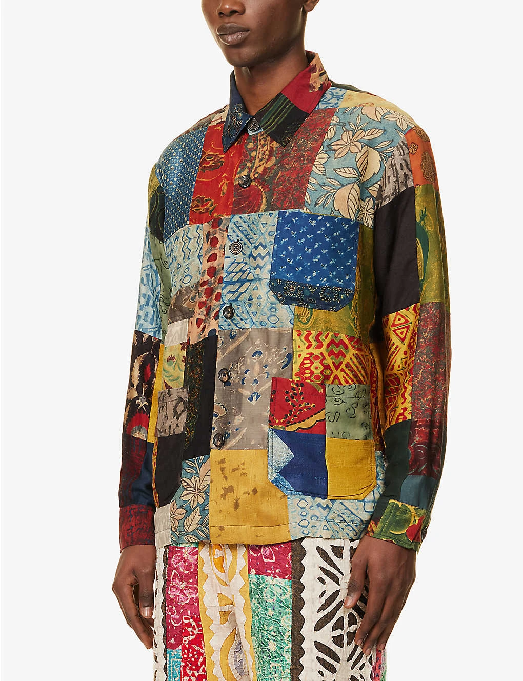- Regular fit, straight-point collar, long sleeves, buttoned cuffs, patch pocket at chest, two patch pockets at front, all-over contrast patchwork panels, hand-printed, handmade