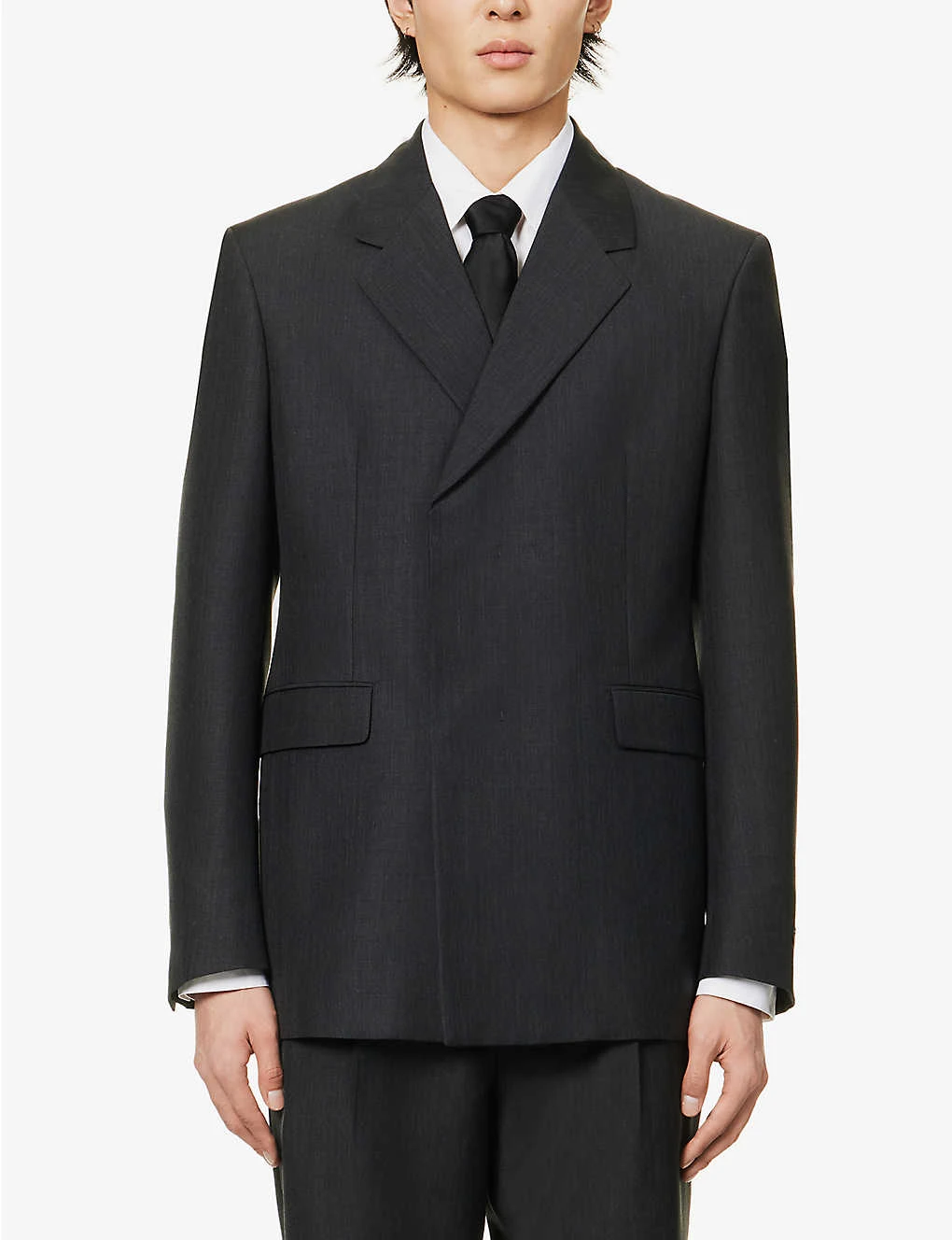 - Regular fit, notched lapels, padded shoulders, long sleeves, buttoned cuffs, darts at front, two flap pockets at front, three slip pockets at interior, fully lined