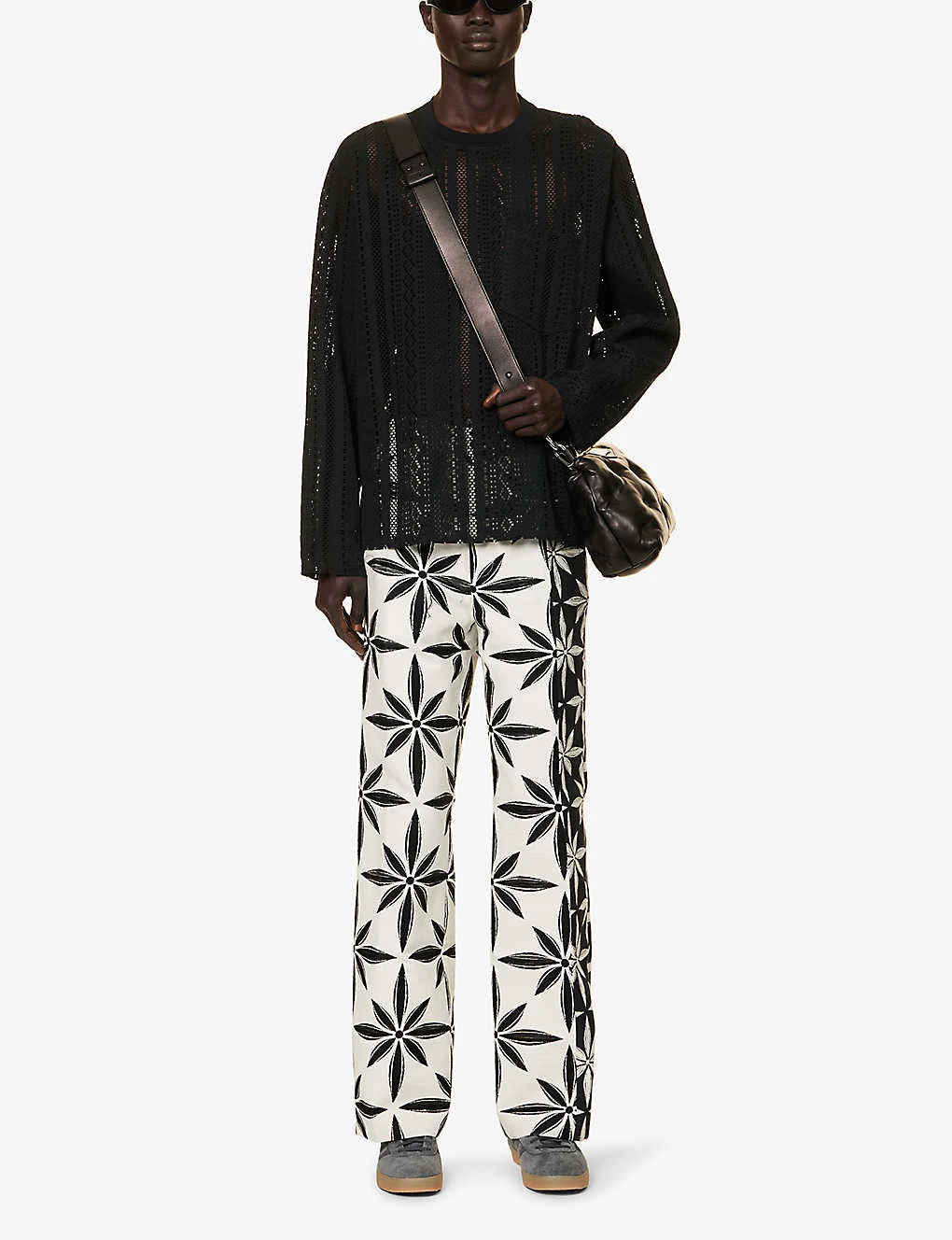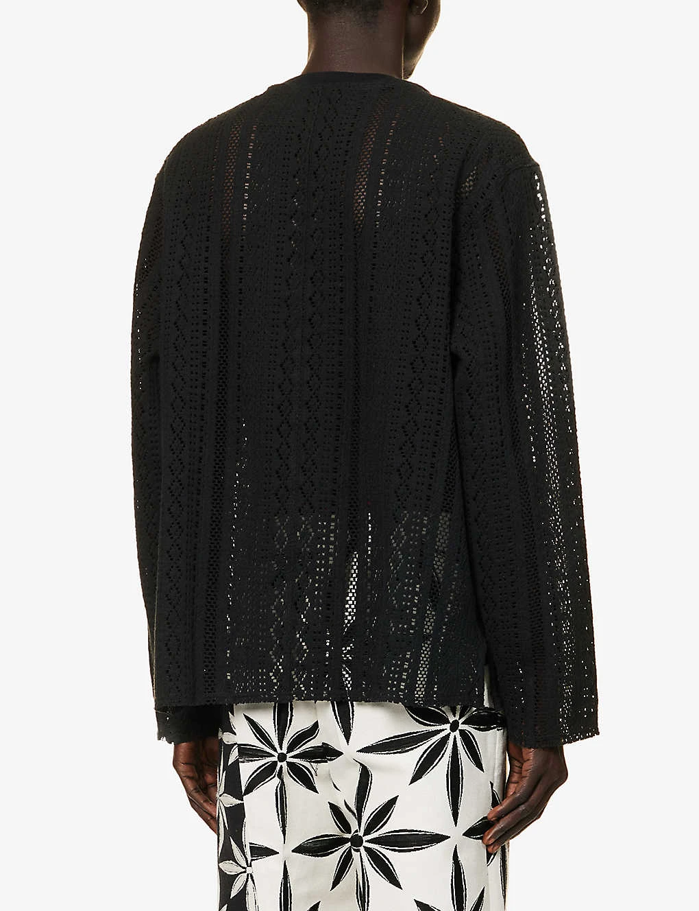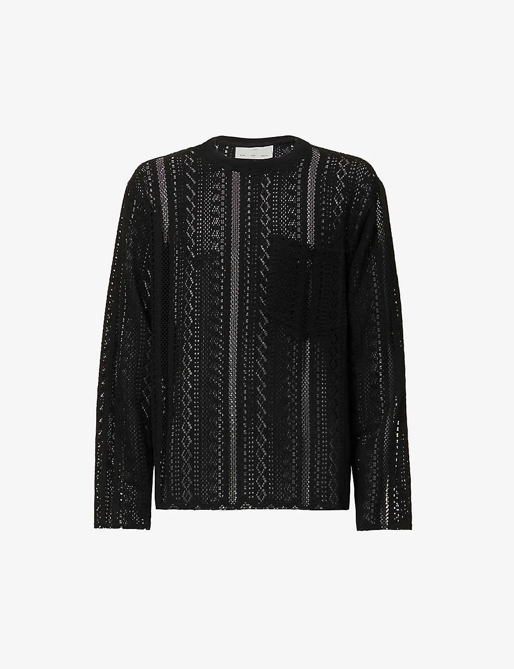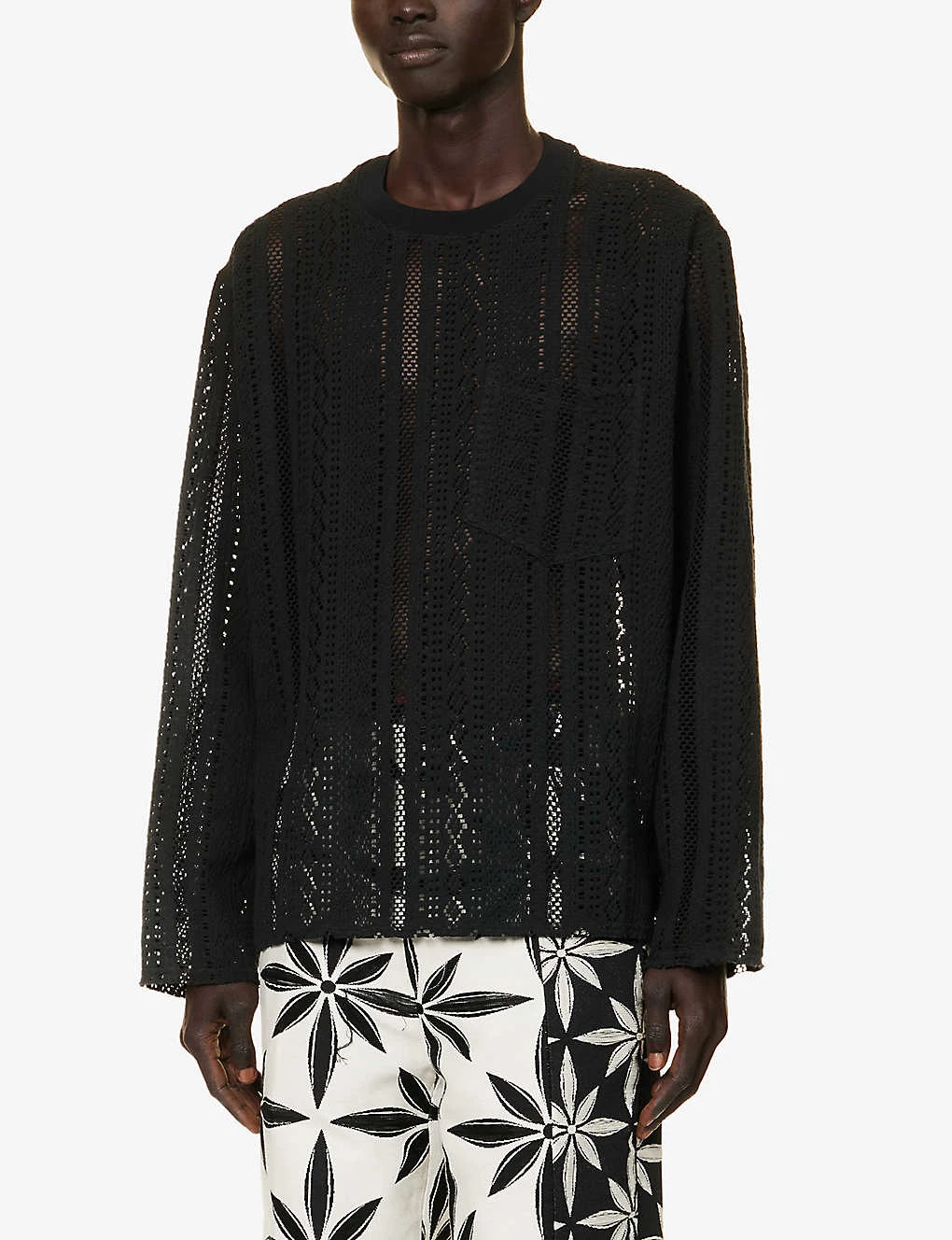 - Oversized fit, crewneck, ribbed trim at neck, dropped shoulders, long sleeves, semi-sheer, patch pocket at chest, all-over geometric knit pattern
