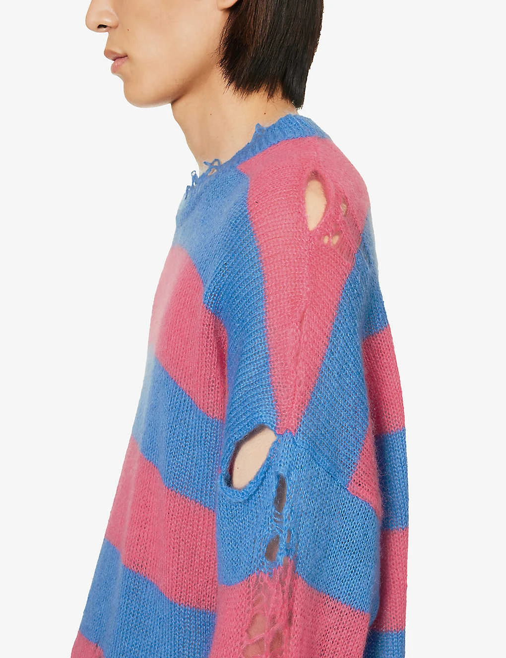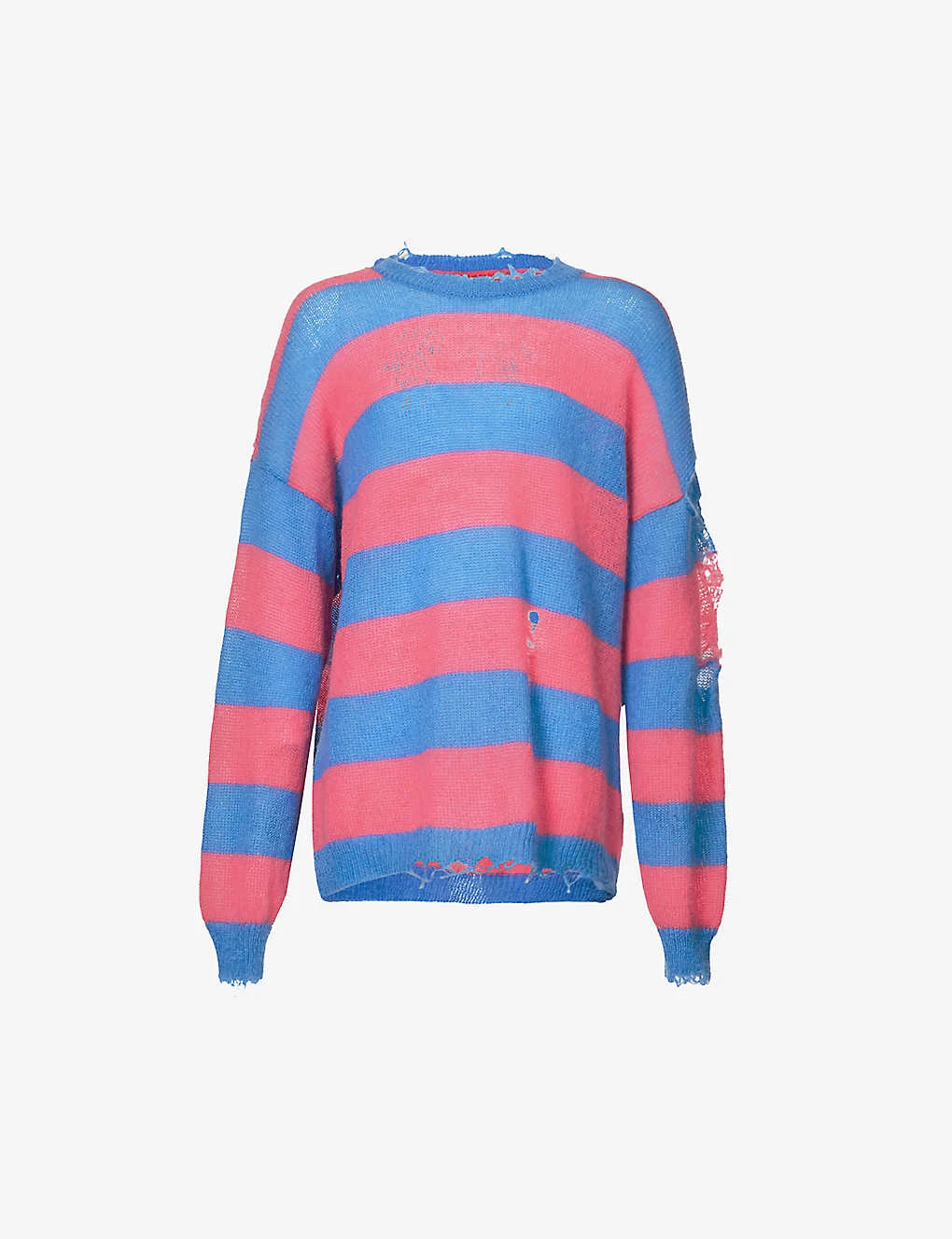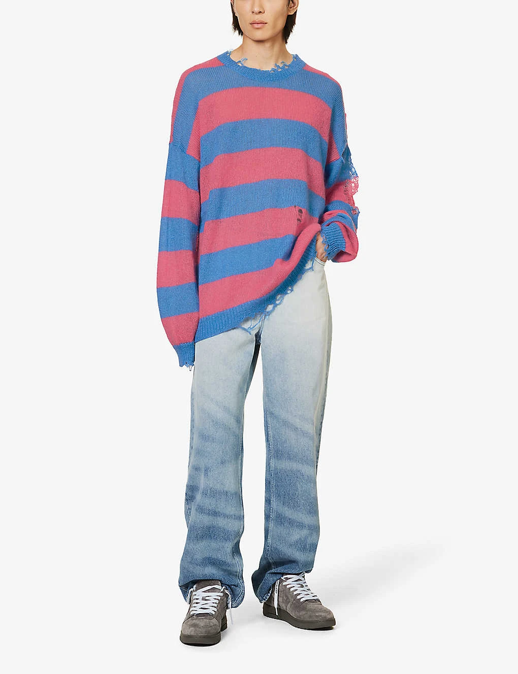 - Oversized fit, crewneck, dropped shoulders, long sleeves, medium knit, all-over striped pattern, ribbed trims, distressed finish