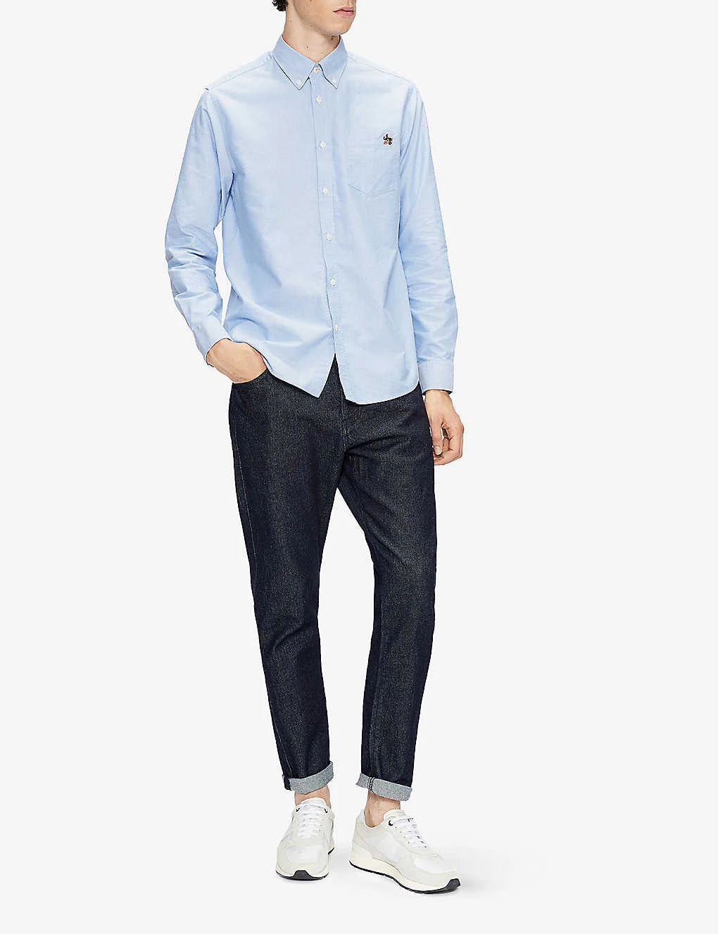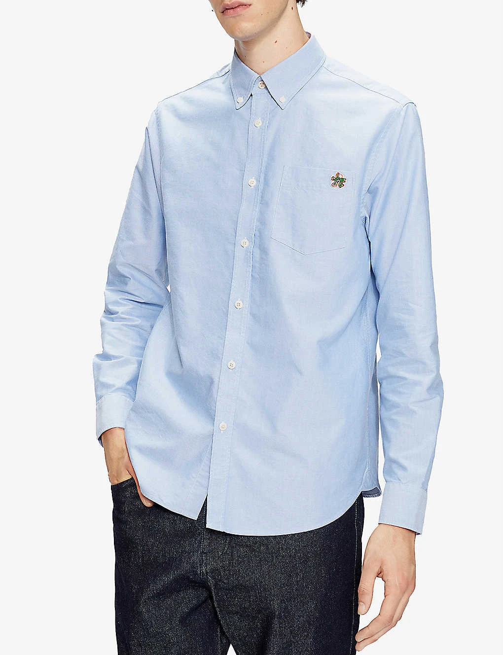 - Relaxed fit, long sleeves, buttoned cuffs, Oxford weave, button-through front, classic collar, breast patch pocket, floral embroidery at chest