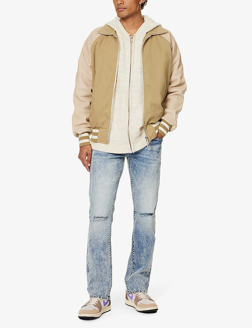 - Relaxed-fit, mid-rise, straight leg, belt loops, five pockets, branded silver-toned hardware, distressed panels at front, all-over faded wash and whiskering, brand patch at back, V-shaped yoke at back, contrast stitching, partially lined