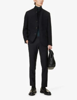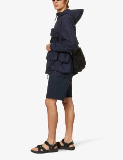 - Boxy fit, dropped shoulders, long sleeves, pleated cuffs, two buttoned flap pockets at chest, two slip pockets at sides, two buttoned waist adjusters at back, branded hardware, all-over brand pattern, partially lined