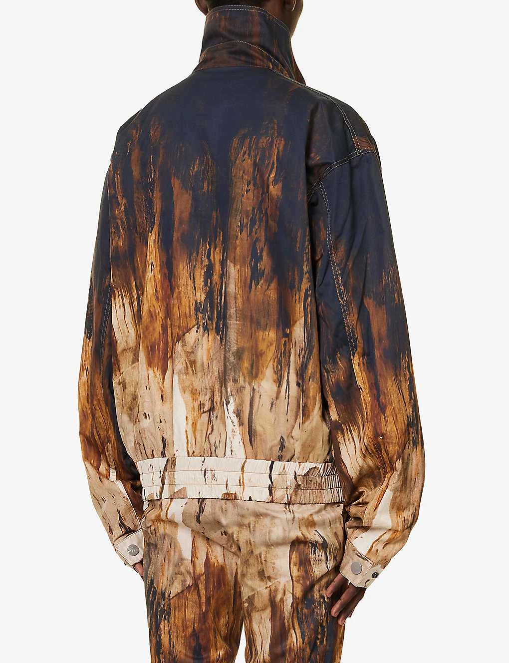 - Relaxed fit, high neck, long sleeves, elasticated cuffs, buttoned epaulette at cuffs and collar, zip pocket and two buttoned pockets at front, orb design embroidery at front, all over abstract print, fully lined, elasticated hem